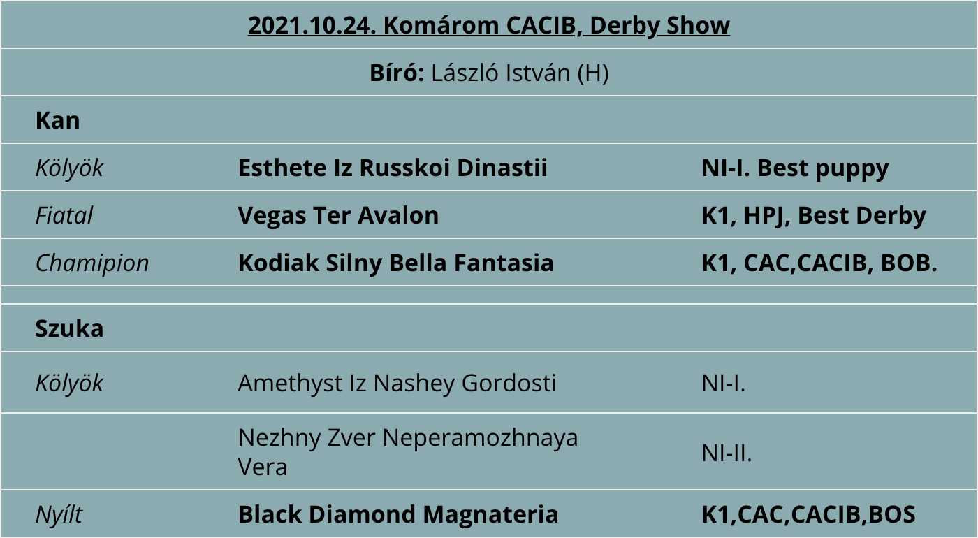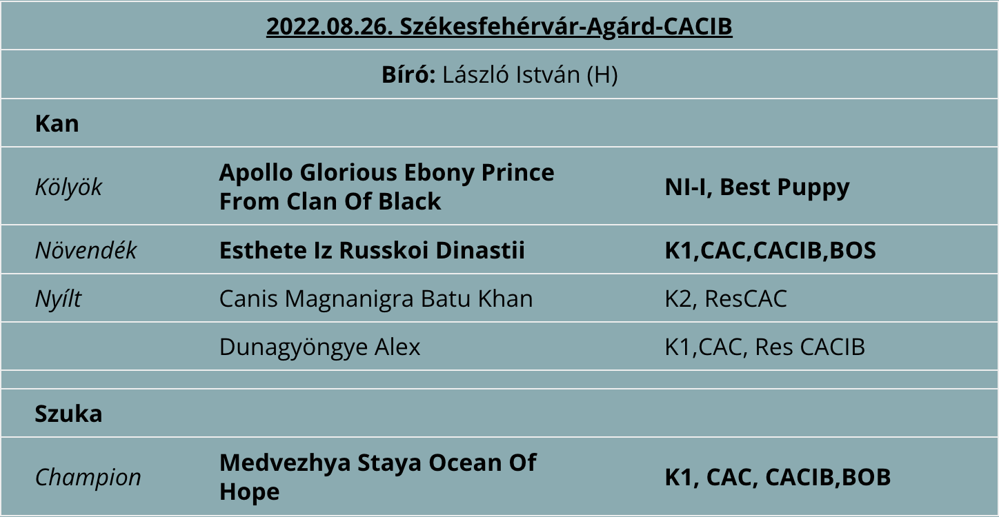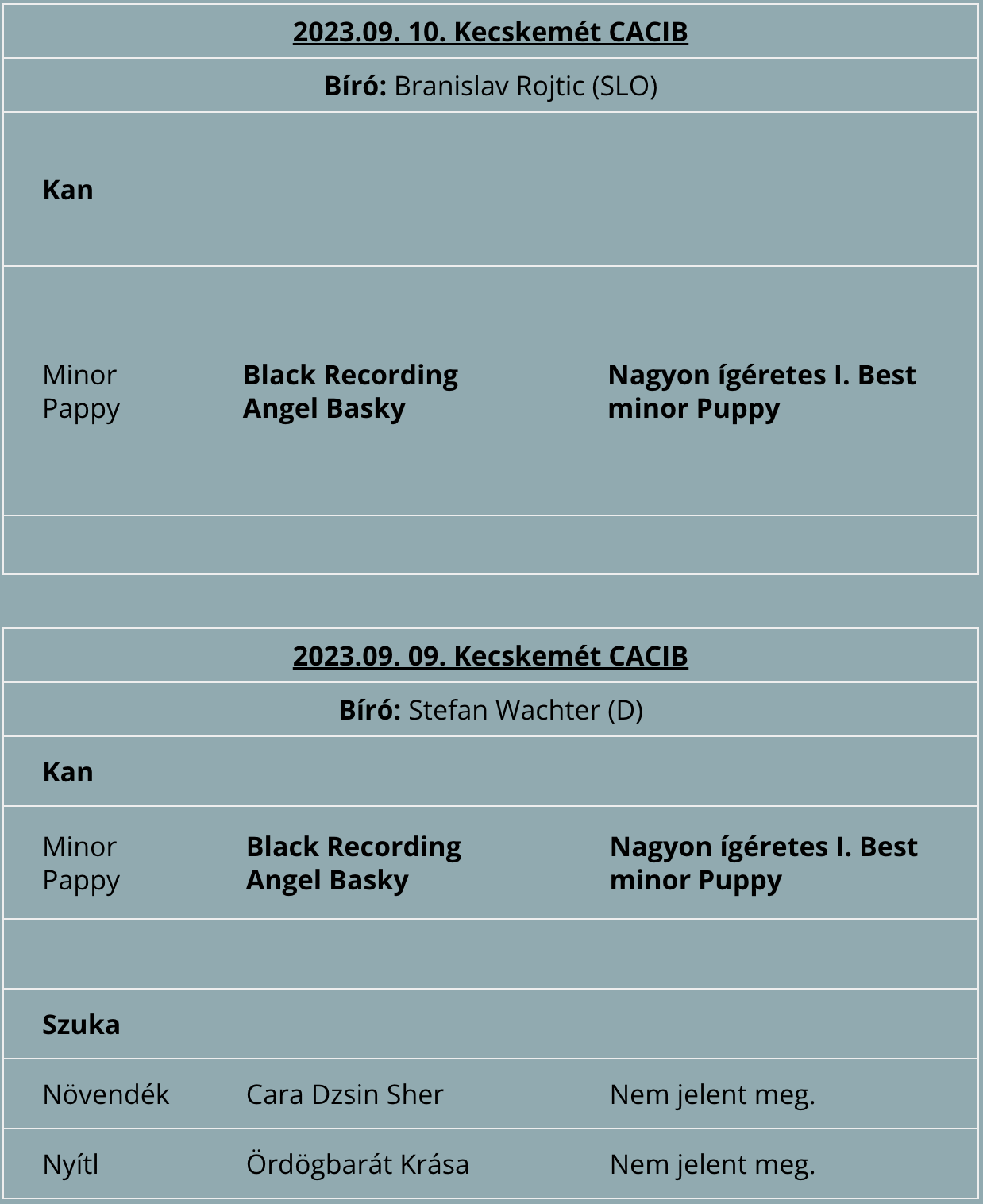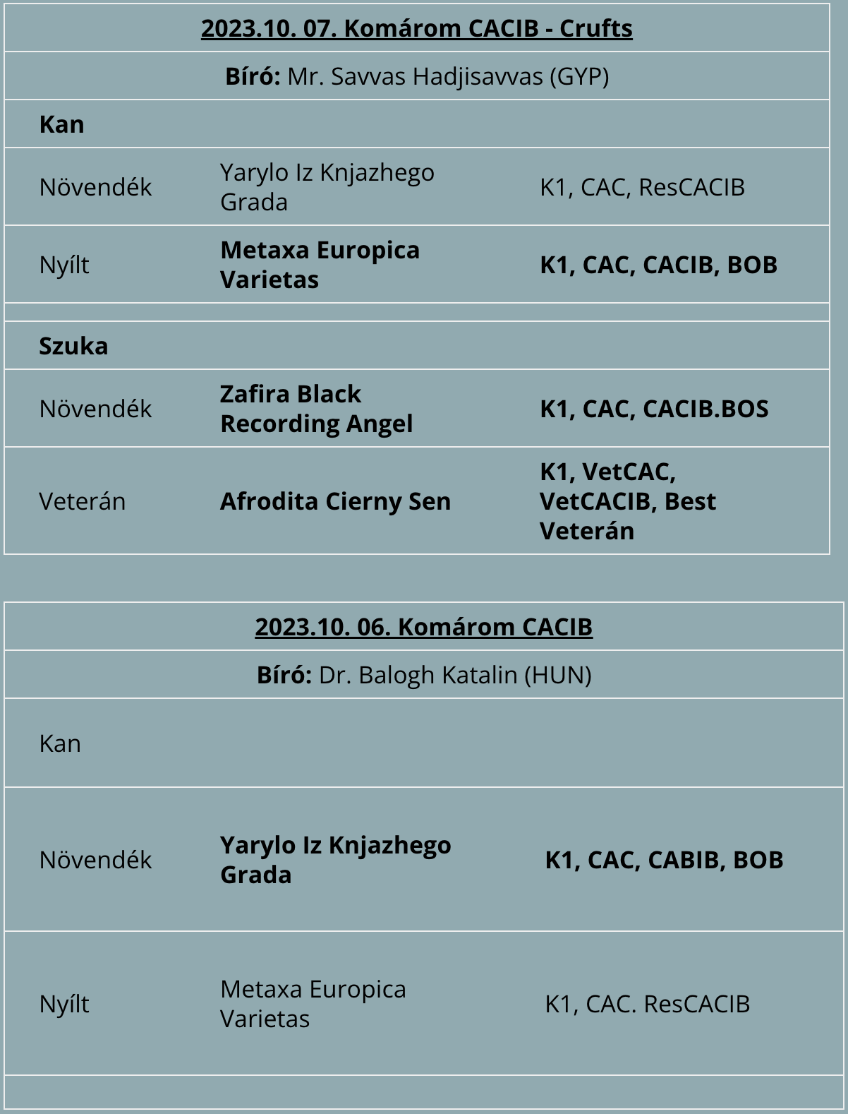 | Növendék | Chaklun Noch Na Kupalu | K1,CAC,CACIB,BOB |
